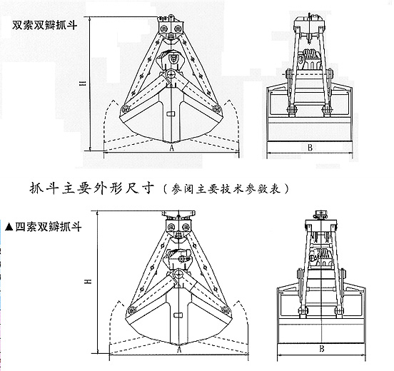 雙索抓斗使用于有雙起升機構(單根繩,提升繩,開閉繩)的各類起重機,多使用于港口、碼頭、建筑路橋等行業(yè)。根據(jù)物料特性可配用輕型、中型、重型、超重型。適用抓取各類松散堆積物。